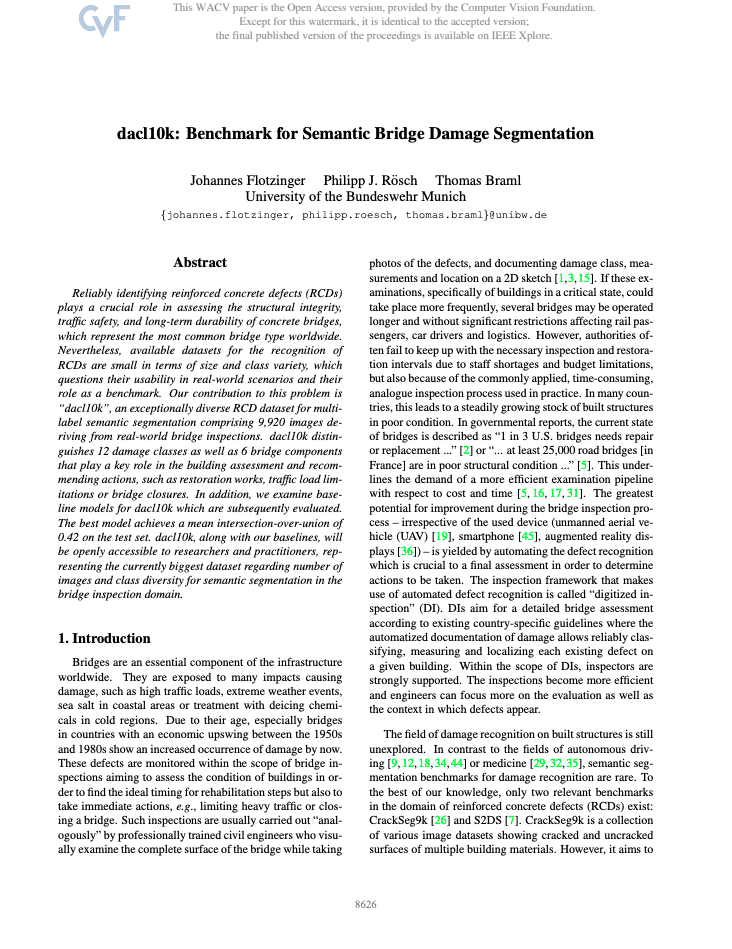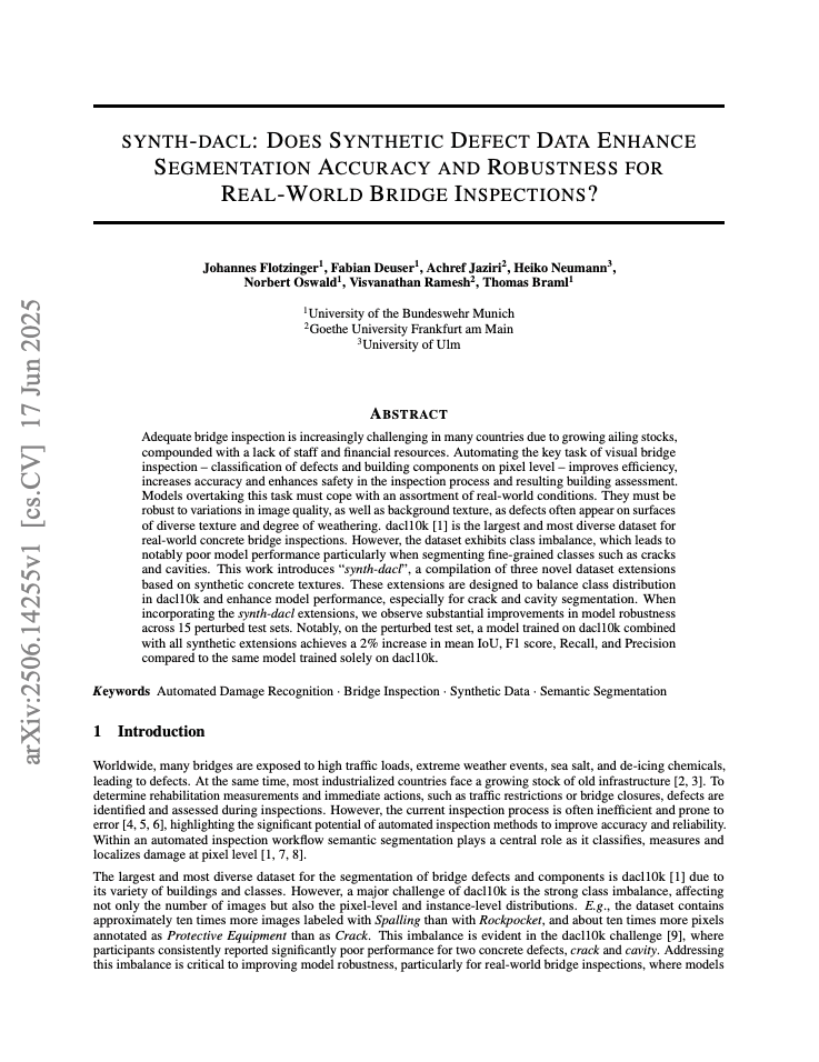 Wir sind Bauingenieure, KI-Forscher und Softwareentwickler von der TU München und der Universität der Bundeswehr München. Unsere Modelle entstehen nicht im Vakuum. Sie basieren auf 9.920 realen Inspektionsbildern, veröffentlicht als dacl10k, dem größten Datensatz für automatisierte Brückeninspektion weltweit. Vorgestellt auf der IEEE/CVF WACV 2024. Wir bauen Software für Ingenieure, weil wir selbst Ingenieure sind.